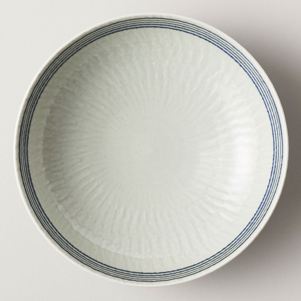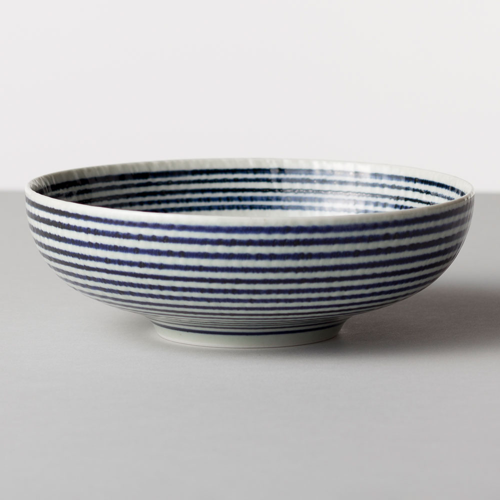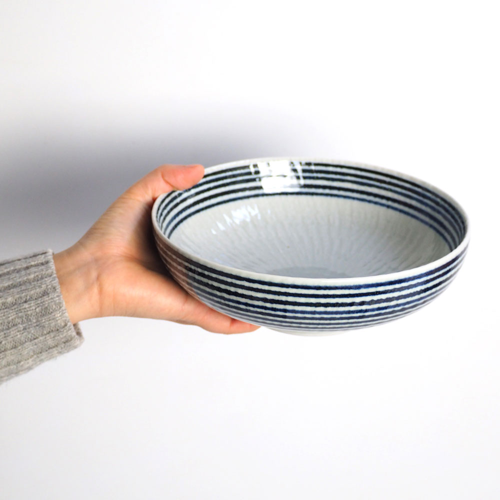 波佐見焼 藍駒 大鉢 日本製 磁器食器 温かみのある手描きのしましま模様 大皿料理やサラダ、うどんやラーメンにも BARBAR マルヒロ 長崎県の工芸品 Aikoma large bowl Nagasaki craft