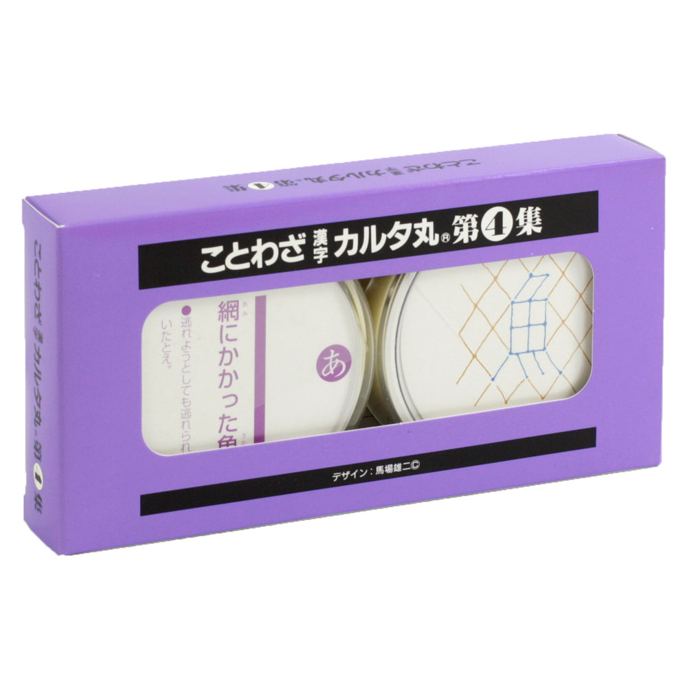 44種類のことわざを集めた珍しい丸型のかるた。もちろんそれだけでは無く、ことわざに出てくる漢字の一部を文字絵風にアレンジし、意味を明快に表現した取札が特徴です。読み手がことわざを読み、取札を取るかるたとなりますが、それだけではなく、取札を見てことわざの意味を当てるなどの遊びも楽しめます。読札には意味も書いてありますので、ことわざをある程度覚えたら、意味だけで取札を探すのも楽しいですよ。