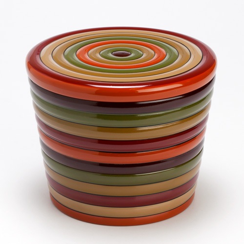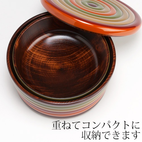 デザインは、漆器では昔から使われていた独楽の柄を、色とりどりの漆の色合いを何段にも重ねて、今までにない斬新なデザインに仕上げました。