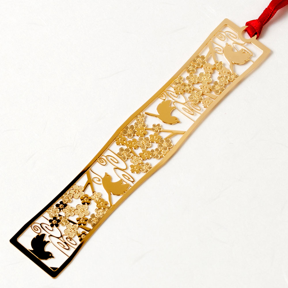 和柄ブックマーカー 梅小鳥 (WAG007) 金の栞シリーズ 24K表面加工 金属製ブックマーカー Metal bookmark Japanese pattern