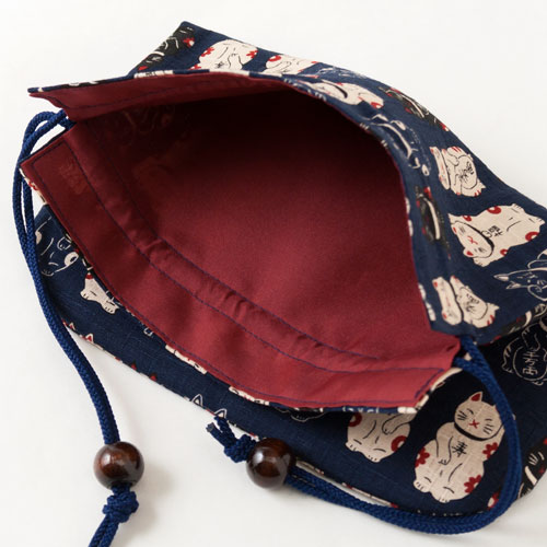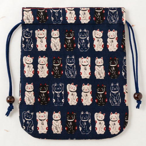 笑福猫のねこづくし巾着袋 紺 Lucky cat pattern drawstring bag