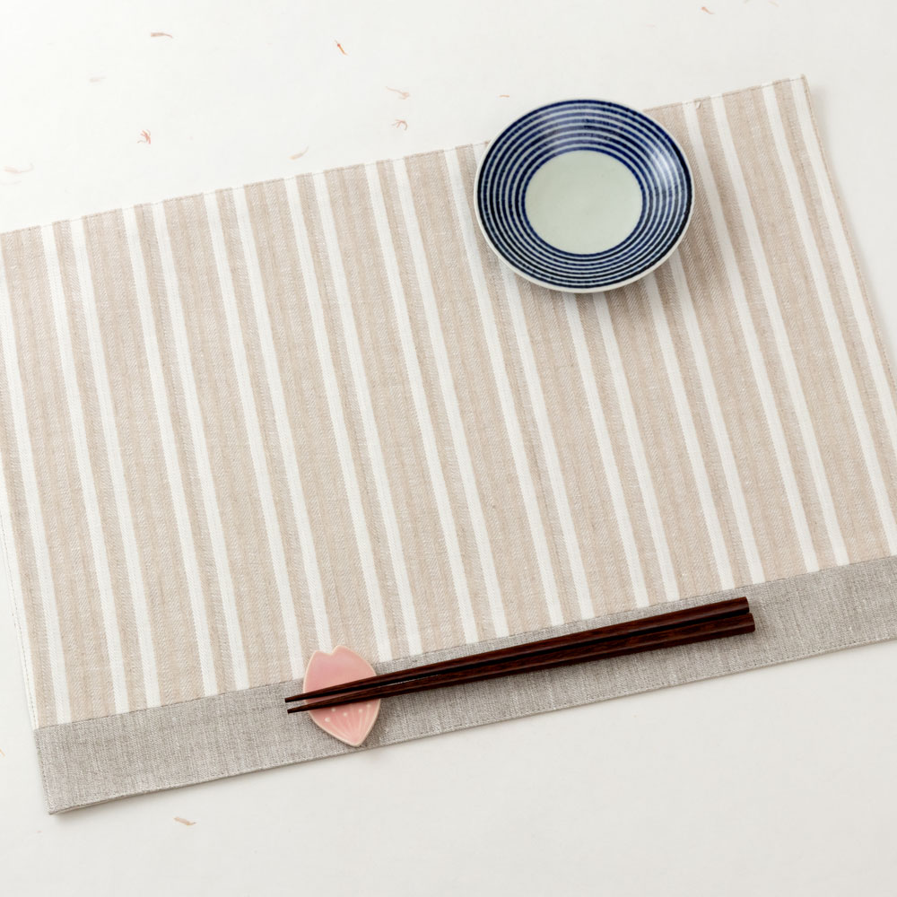 シンプルなカラーの日本の布に、柄を用いたランチョンマット。