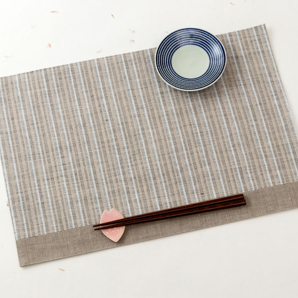 シンプルなカラーの日本の布に、柄を用いたランチョンマット。