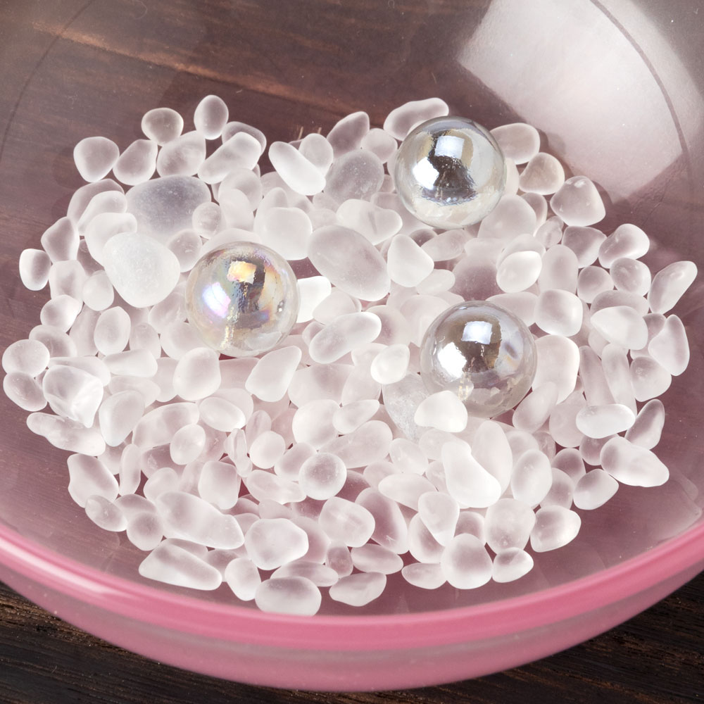 浮き玉は入っていませんが、カラー砂利と、水泡をイメージした透明のビー玉が付属しています。