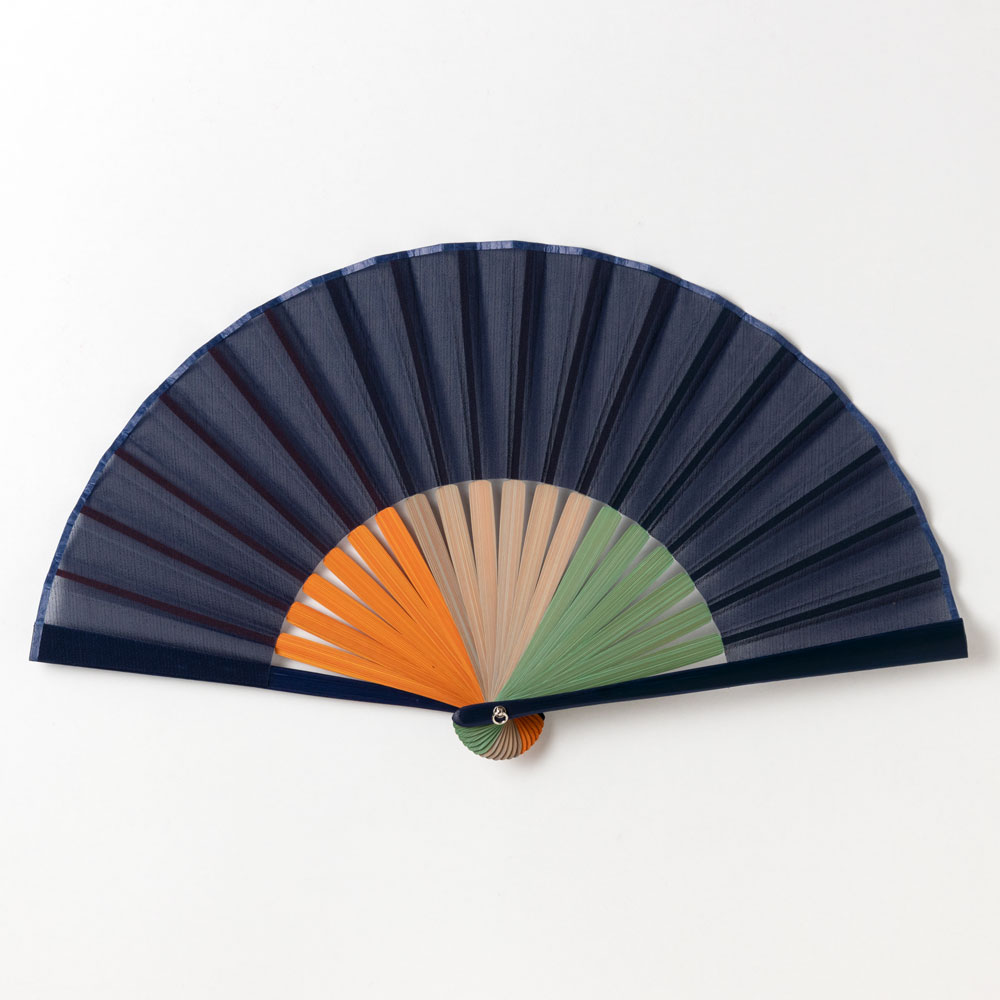 カラフルな扇骨に透け感のある扇面生地を合わせた、シンプルモダンな雰囲気の扇子です。