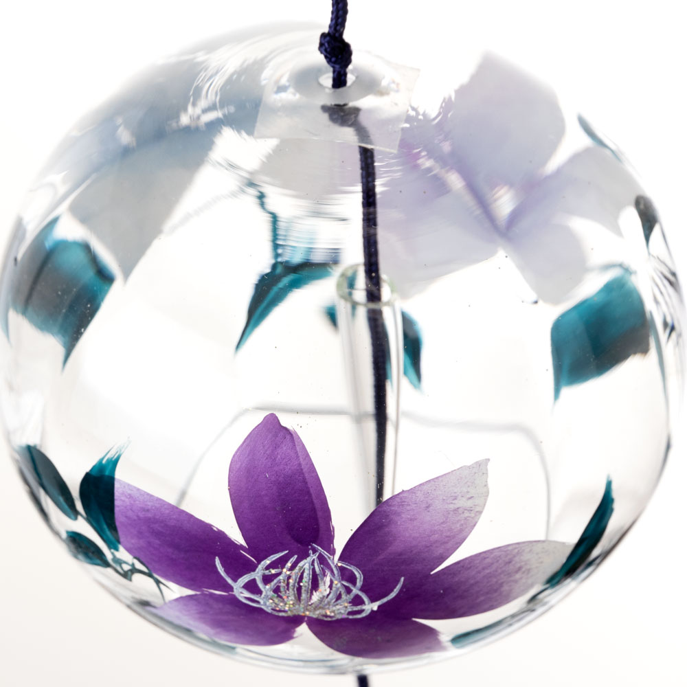クリスタルガラスを使用した、ぬくもりのある透明感が特徴の風鈴に、その透明感を生かした柄を内側にさりげなく描いた、立体感のある柄のガラス風鈴。