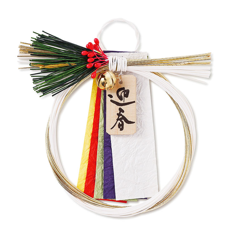 幸を結ぶ水引と、季節(五時)や方位(五方)をあらわす厄除けの五色とを組み合わせ、慶春の飾りに仕立てました。
