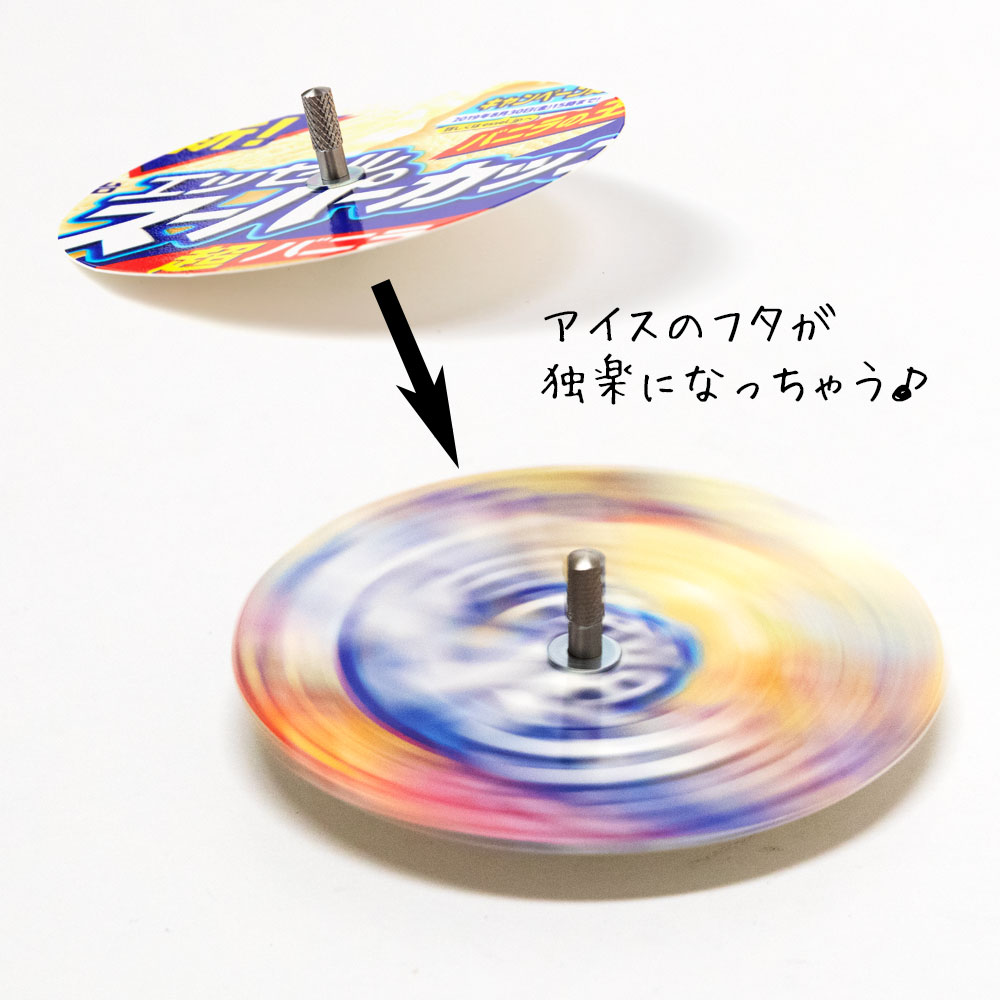 例えばアイスのフタの真ん中に穴を開け、こまのもとを付けると独楽の完成!