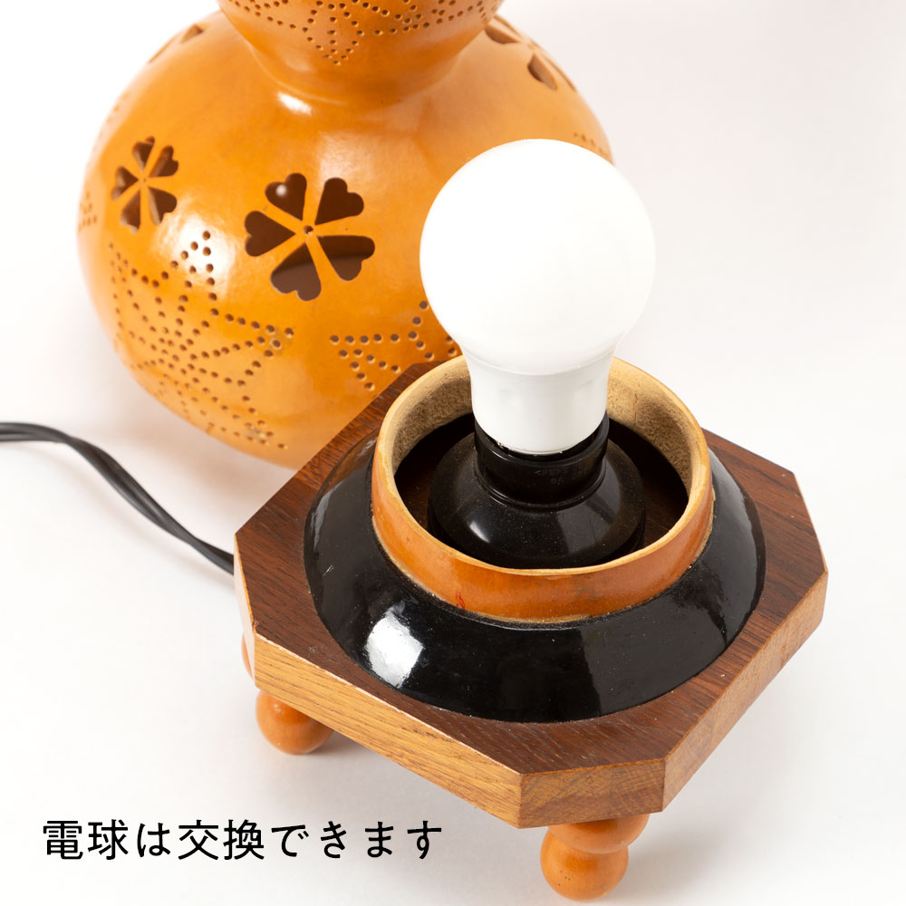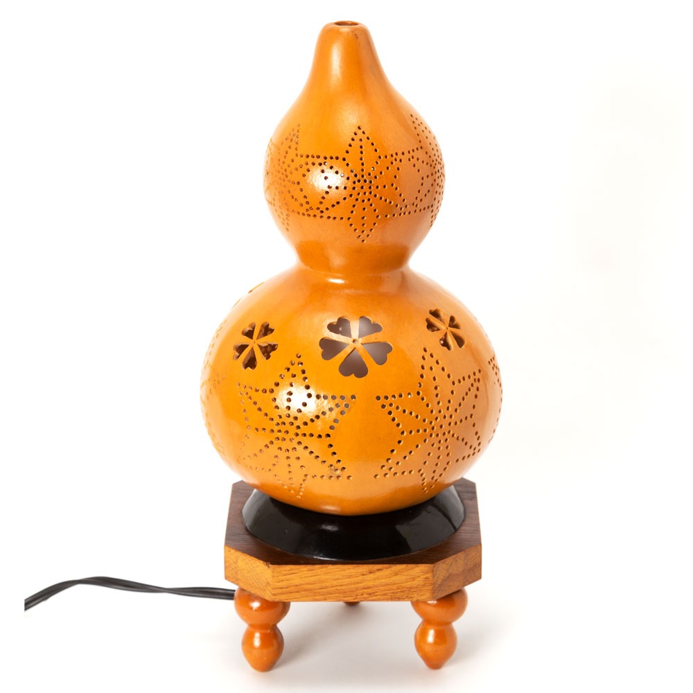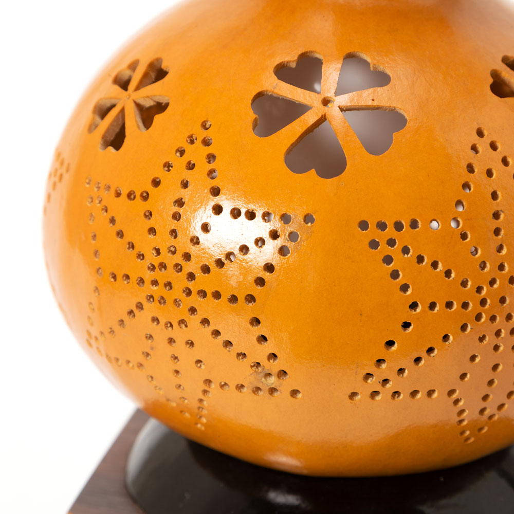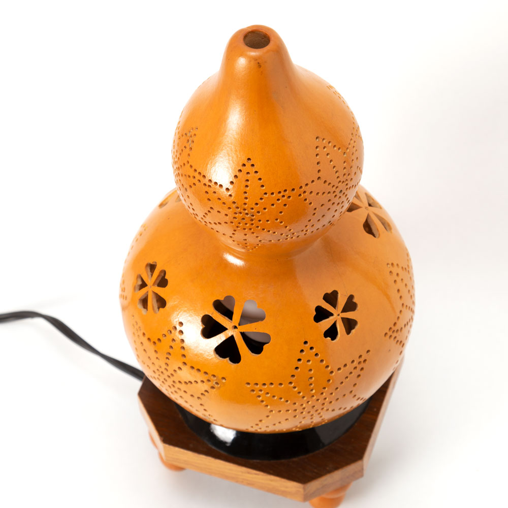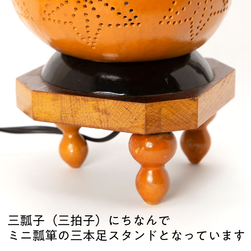 この行灯は、中をくり抜き、完全に乾燥させた瓢箪に大小の穴を開け、光の通り道を作ったランプシェードです。