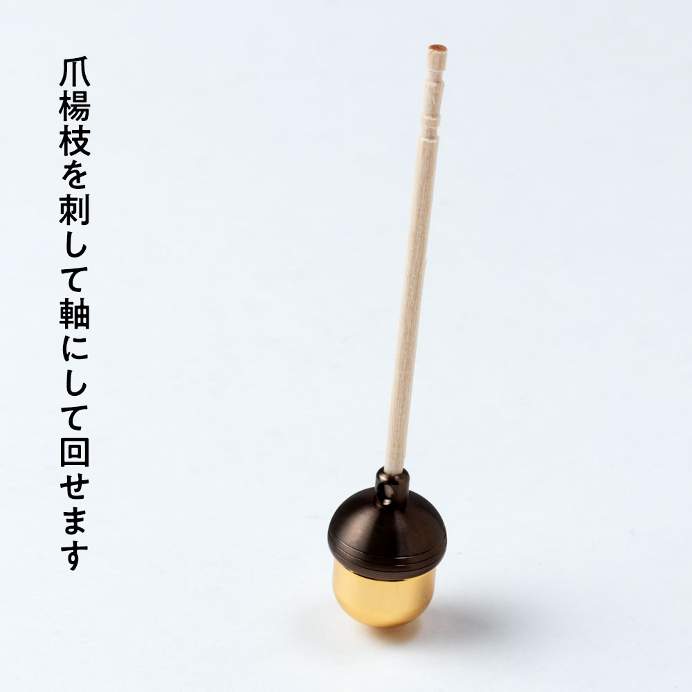 ストラップをはずして爪楊枝を刺すと、独楽に変身いたします。