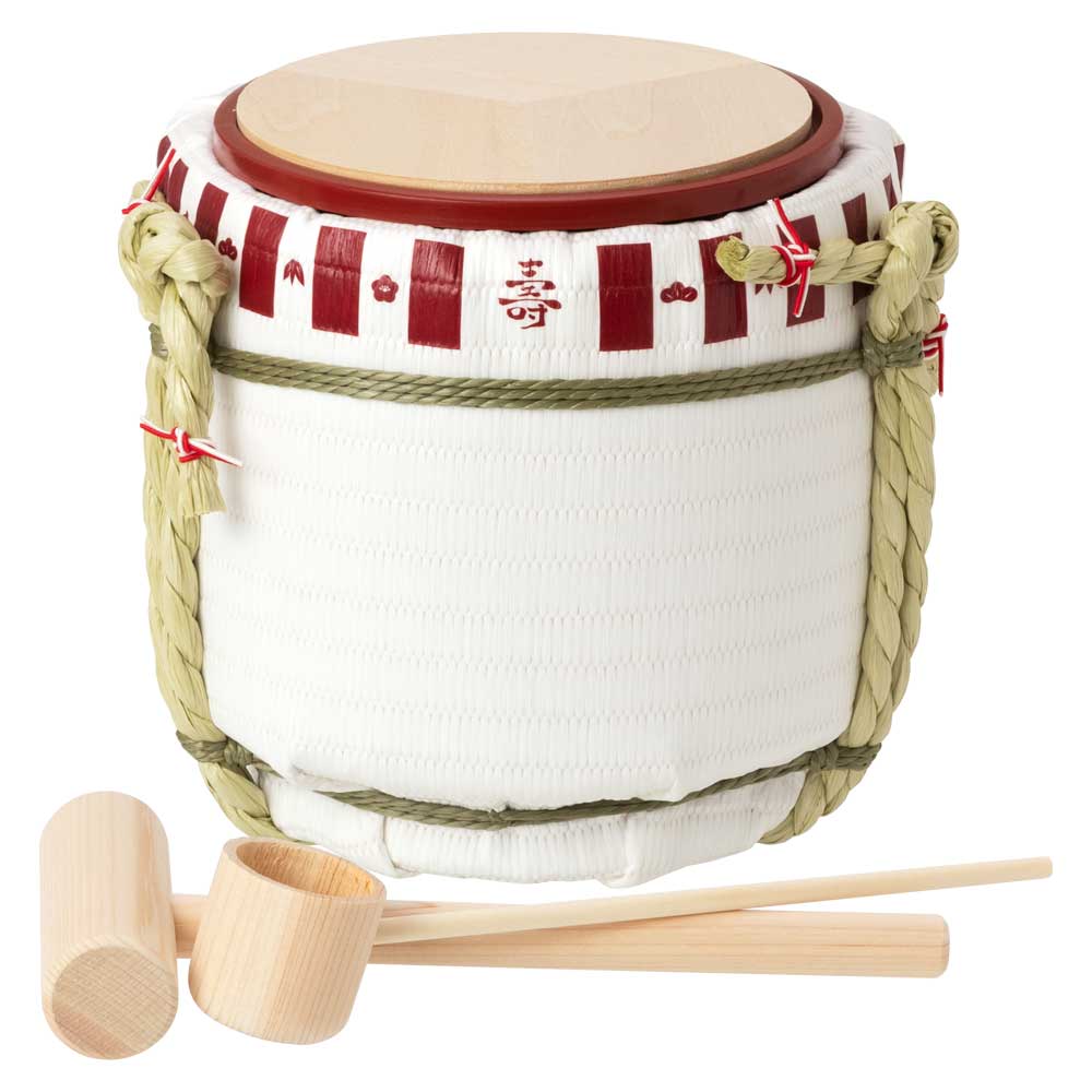 内容:ミニ鏡開き本体1個・アクション鏡板1枚・ミニ木槌1本・ミニ木杓1本・朱桶1点・取扱説明書