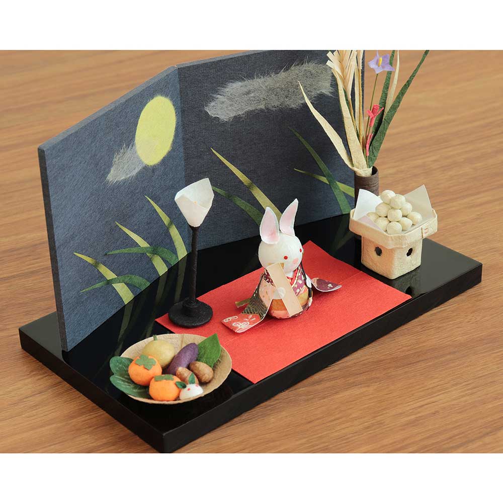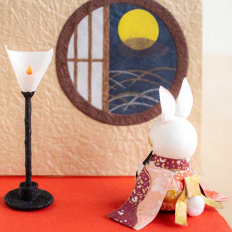 十五夜の月を見つめ歌を詠む白うさぎ、明かりを灯した燭台、緋毛氈(ひもうせん)を、小ぶりな手のひらサイズに仕立てました。