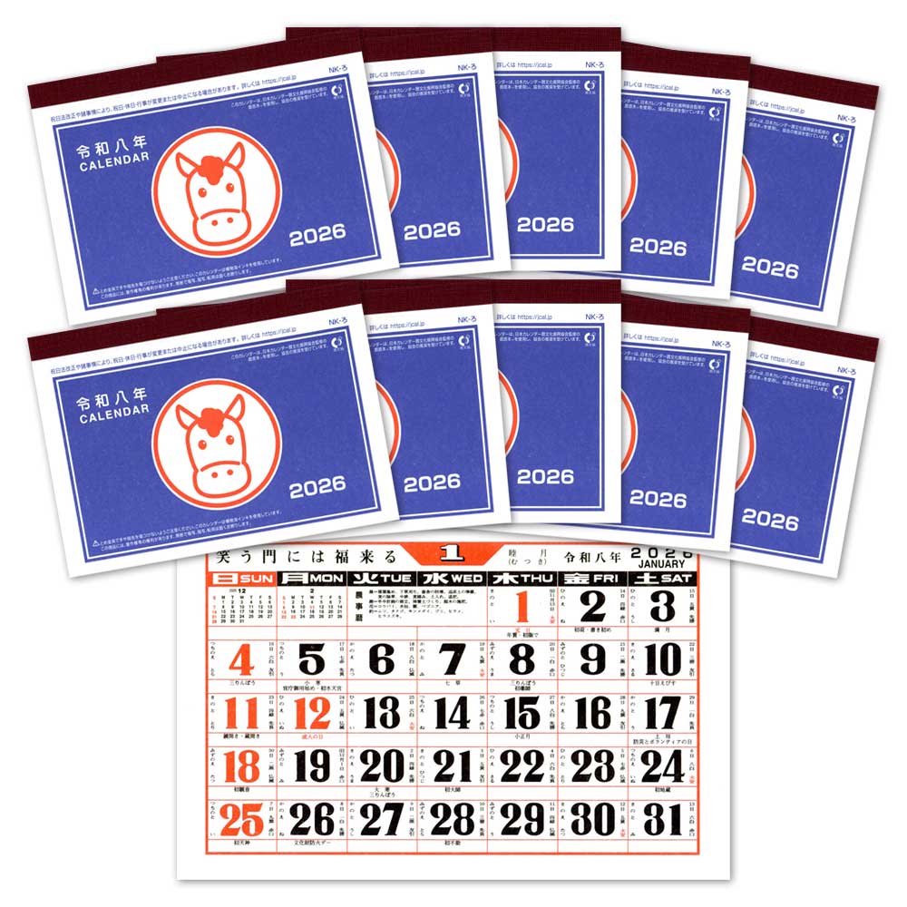 【10個パック】昭和レトロ 手帳サイズのカレンダー(10個) 干支・午(うま) 令和八年(2026年) 薄型でかさばらない 昔ながらのスタイル ことわざ 六曜 十干 九星 二十四節気