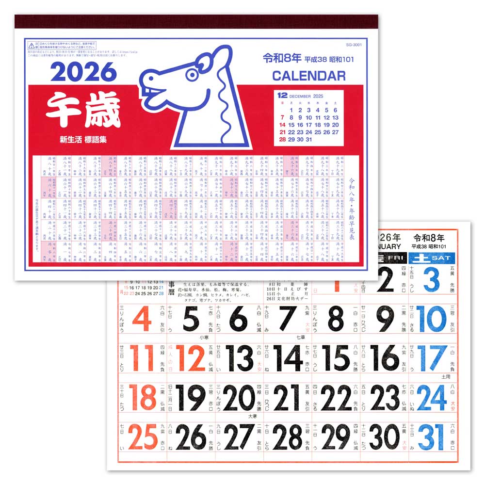 昭和レトロ A4ノートに挟めるサイズの薄型カレンダー(1個) 厚さ約1mm 干支・午(うま) 令和八年(2026年) 薄型でかさばらない 昔ながらのスタイル ことわざ 六曜 十干 九星 二十四節気