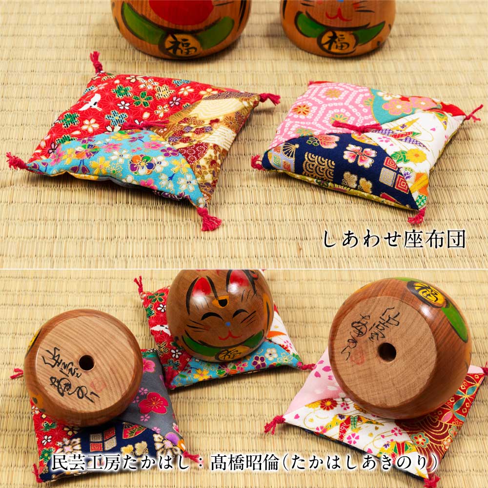 また、座布団にもこだわりがあり、4枚の柄の違う布を縫合わせて製作する座布団は、「しあわせになりたい」との思いからしあわせ「4合わせ」座布団と呼んでいます。