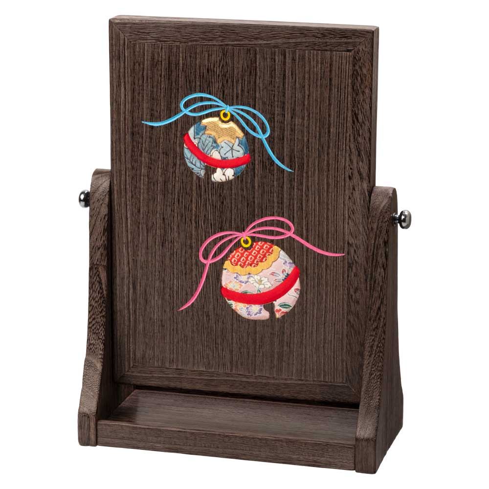 鏡の反対面には、箱長の伝統柄である鈴の木目込み細工が施された、シックで縁起の良い小物となっています。