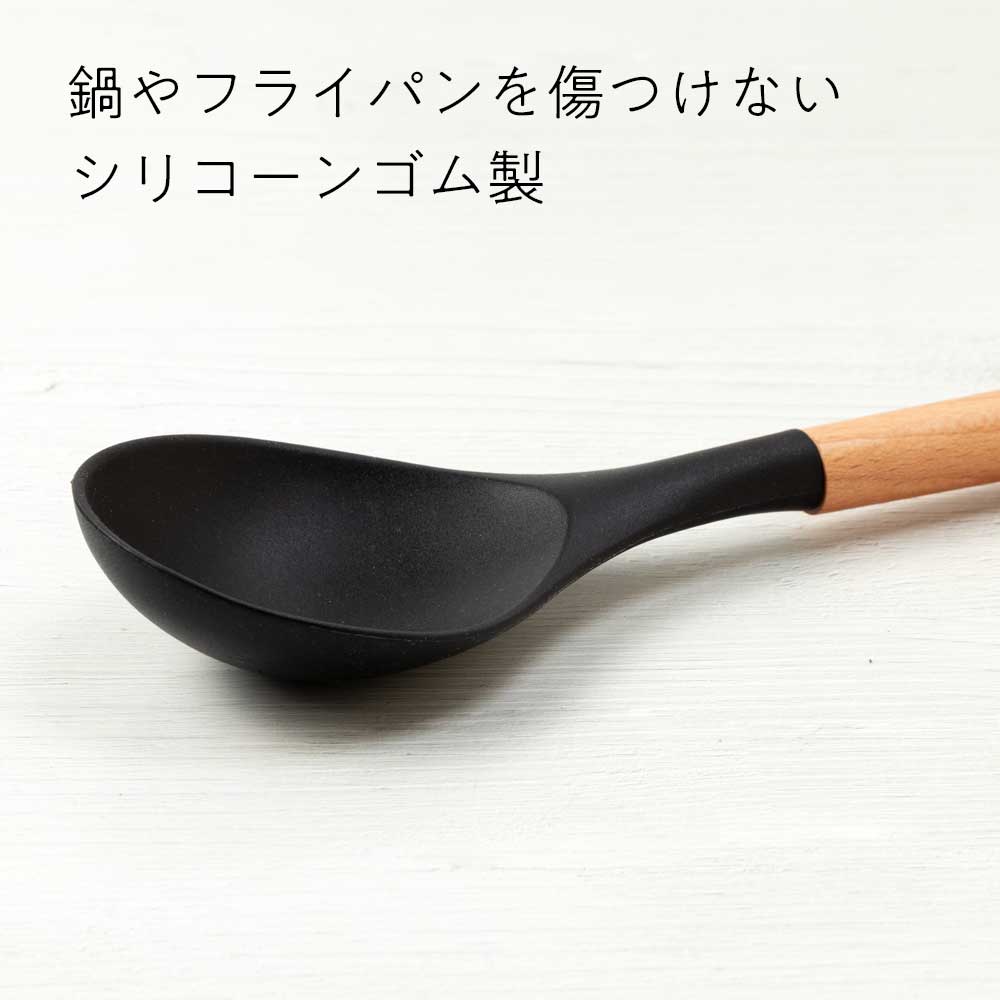ウッドブラック 6点セット レードル・ターナー・調理スプーン・メッシュスプーン・パスタレードル・スパテラ キッチンツール おしゃれな見せる収納に 吊るし紐付き 天然木+シリコーンゴムの丈夫な調理器具
