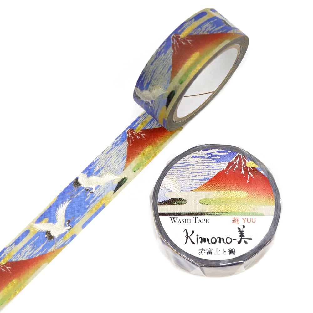 SAIEN Kimono美 遊YUU マスキングテープ 赤富士と鶴 15mm (GR-2061) 7m巻 レトロモダン 金箔グラデーション 和紙ステーショナリー